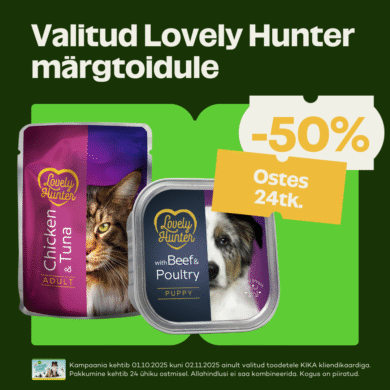 Valik Lovely Hunter märgtoite on nüüd -50%. Kampaania kehtib 01.10.2025 kuni 02.11.2025 ainult valitud toodetele KIKA kliendikaardiga.