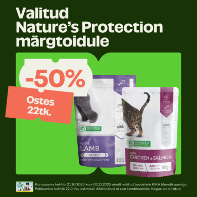 Valitud Nature’s Protection märgtoidule on soodustus -50%. Kampaania kehtib 01.10.2025 kuni 02.11.2025 ainult valitud toodetele KIKA kliendikaardiga.