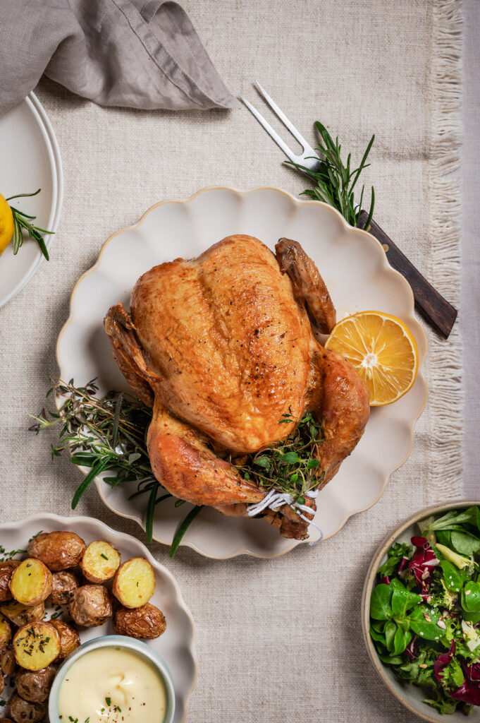 Sega sool, pipar ja poole sidruni riivitud koor ning hõõru kana nii seest kui ka väljast saadud seguga kokku. Pista kana sisemusse ürdituust, terve sidrun ja soovi korral mõned küüslauguküüned. Määri kana õliga ja kinnita soovi korral koivad kööginööriga. Küpseta ahju keskmises osas 220-kraadise kuumuse juures u 1-1,2 h või kuni kana on jumekas ning kintsuosa noaga torgates on sealt väljuv vedelik selge.