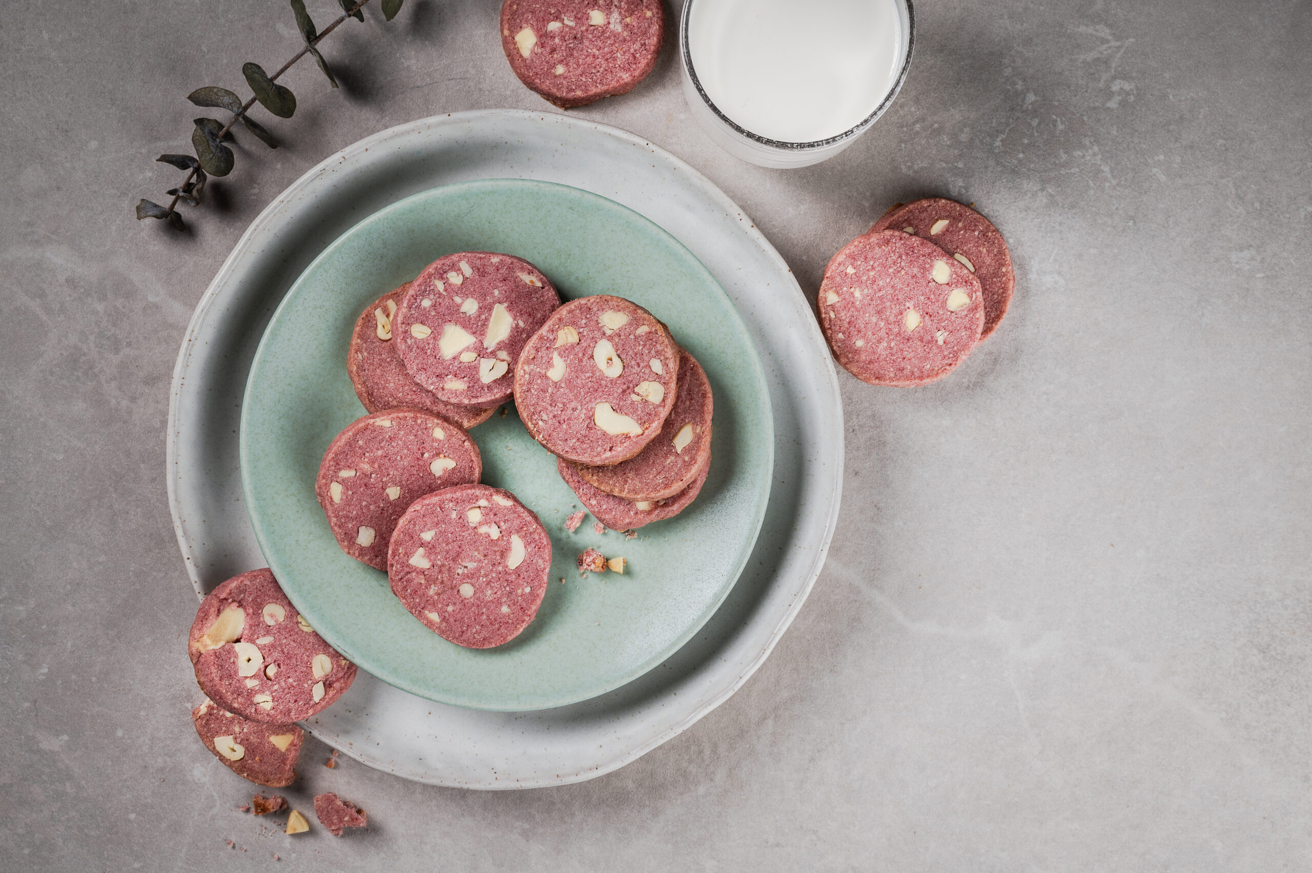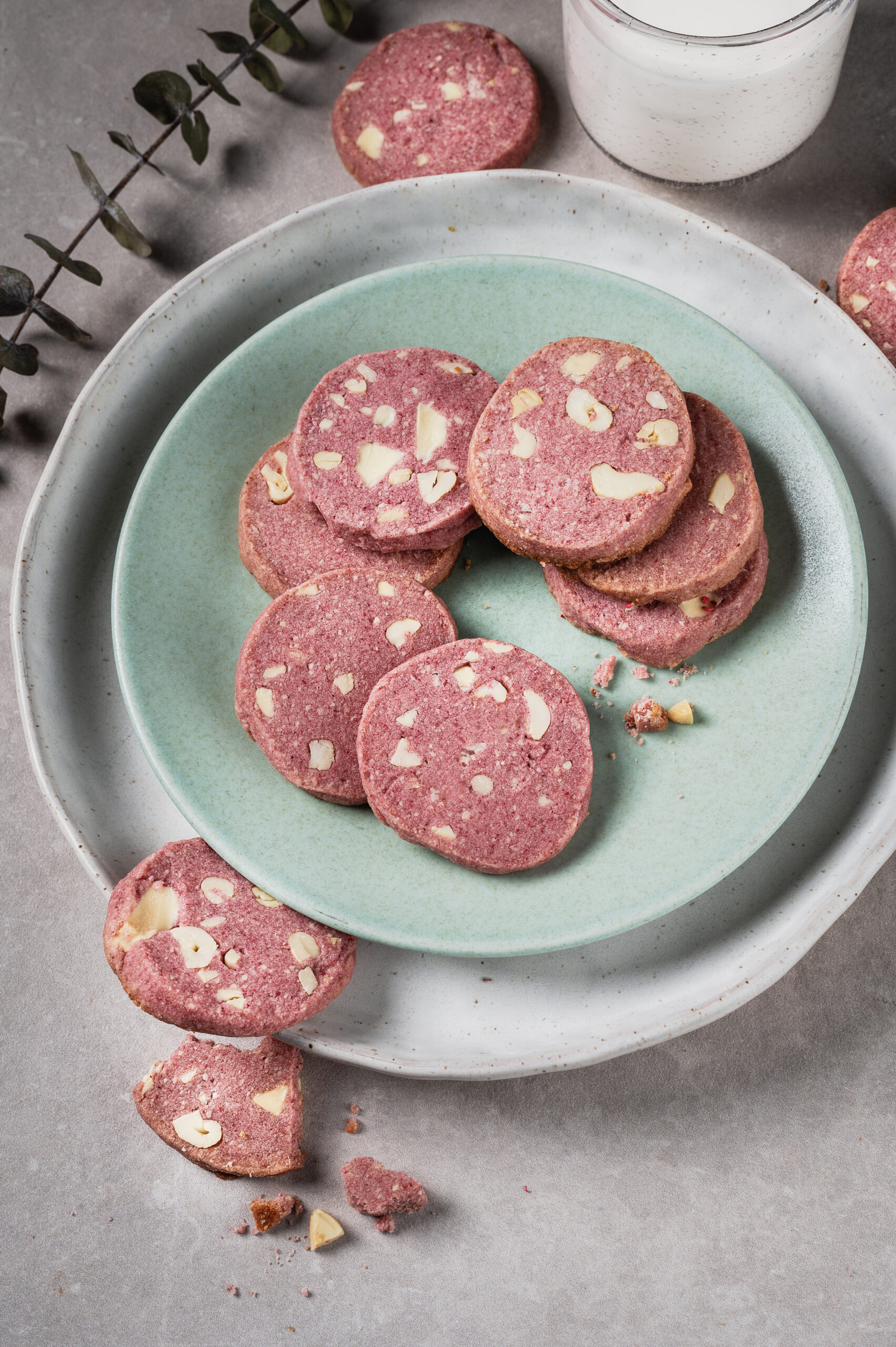 Vahusta pehme või suhkruga u 5 minuti jooksul heledaks vahuks. Kõige mugavam on seda teha lauamikseri abil. Samal ajal tee muud ettevalmistused: purusta vaarikad köögikombainis ja sõelu tiheda sõela abil eraldi nõusse. Haki ka šokolaad ja pähklid. Lisa tainale munavalge, jahu, sool, mandlijahu ning sõelutud vaarikad ja sega ühtlaseks massiks. Tõsta tainas töötasapinnale ja vajuta lapikuks. Lisa taina keskele hakitud šokolaad ja pähklid ning voldi tainas kokku. Mudi ja sõtku kergelt, kuni pähklid/šokolaad on tainaga segunenud. Tõsta tainas küpsetuspaberile ja keera tihedaks, u 8 cm paksuseks rulliks. Keera saadud rull veel omakorda köögikilesse ja tõsta külmikusse paariks tunniks või järgmise päevani maitsestuma ja tahenema. Lõika saadud „vorstist“ u 1 cm paksused viilud ja küpseta ahju alumises osas 170-kraadise kuumuse juures u 10 minutit – küpsised peaksid olema alt jumekad, aga veel veidi pehmed (need tahenevad jahtudes). Eemalda küpsised ahjuplaadilt ettevaatlikult pannilabida abil ja tõsta restile jahtuma.